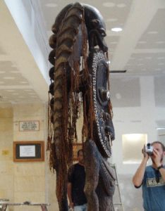 After returning to the mainland we had an extra day in Port Moresby which afforded us the opportunity to research some very interesting indigenous wood carvings on display [Figures 11 and 12]. They depict a witch doctor with a reptilian form upon his shoulders. The creatures display a lizard-like ear, forked tongue, elongated snake-like neck, shallow beak, scaly membrane wings, dermal bumps running down their back, webbed feet, and a long tail (in one case being swallowed by a crocodilian). The statute displays a “hairy” appearance, reminiscent of the Rhamphorynchus reconstruction at the Minneapolis Museum of Natural History.