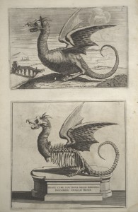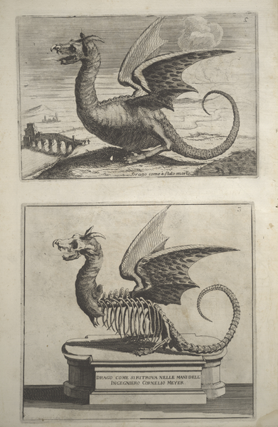 A dragon was supposed to have lived near Rome in December, 1691. According to the story, the animal inhabited a cave and terrorized the local population. After its demise, a sketch of the skeleton [Figure 7] survived in the possession of an Ingegniero Cornelio Meyer. It seems to be a credible pterosaur specimen. There is a clear indication of a head crest. Five digits are visible for each foot. The upper arm bone can be seen at the front of the wing as well as the hint of the prototagium (in front of the lighter colored upper arm of the near wing). The membrane wings are shown in front of the legs, on the vertebrae, matching the fossils. The femur is properly shown as a single bone. The tibia and fibula, the twin lower leg bones, are visible too. Some have suggested that it could be a fossil or faked composite, but it is much too accurate to be considered a fabrication. The survival of the skin suggests that it is not a fossil since it includes accurate wing features, a head crest, and reptilian ears.