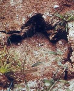 “In the swampy jungles of western Africa, reports persist of an elephant-sized creature with smooth, brownish-gray skin, a long, flexible neck, a very long tail as powerful as a crocodile’s, and three-clawed feet the size of frying pans. Over the past three centuries, native Pygmies and Western explorers have told how the animals feed on the nutlike fruit of a riverbank plant and keep to the deep pools and subsurface caves of waters in this largely unexplored region. After a recent expedition there, two American researchers conclude that these stories refer to a real animal, not a myth. Fantastic as it seems, Roy Mackal [University of Chicago] and James Powell believe that this creature, called ‘Mokele Mbembe’ by the natives, may actually be a dinosaur, perhaps one resembling brontosaurus, which is thought to have died out 70 million years ago.” (Anonymous, “Living Dinosaurs,” Science-80, vol. 1, November 1980, pp. 6-7.) Roy Mackal’s research regarding the Mokele-mbembe led him deep into the central swamps of the Congo. He returned with a numerous credible reports and a historic footprint photo (bottom left). Dr. Mackal wrote a book entitled Living Dinosaur? about his multiple trips and on page 225 he displays a picture of what he believes the creature looked like (above left).