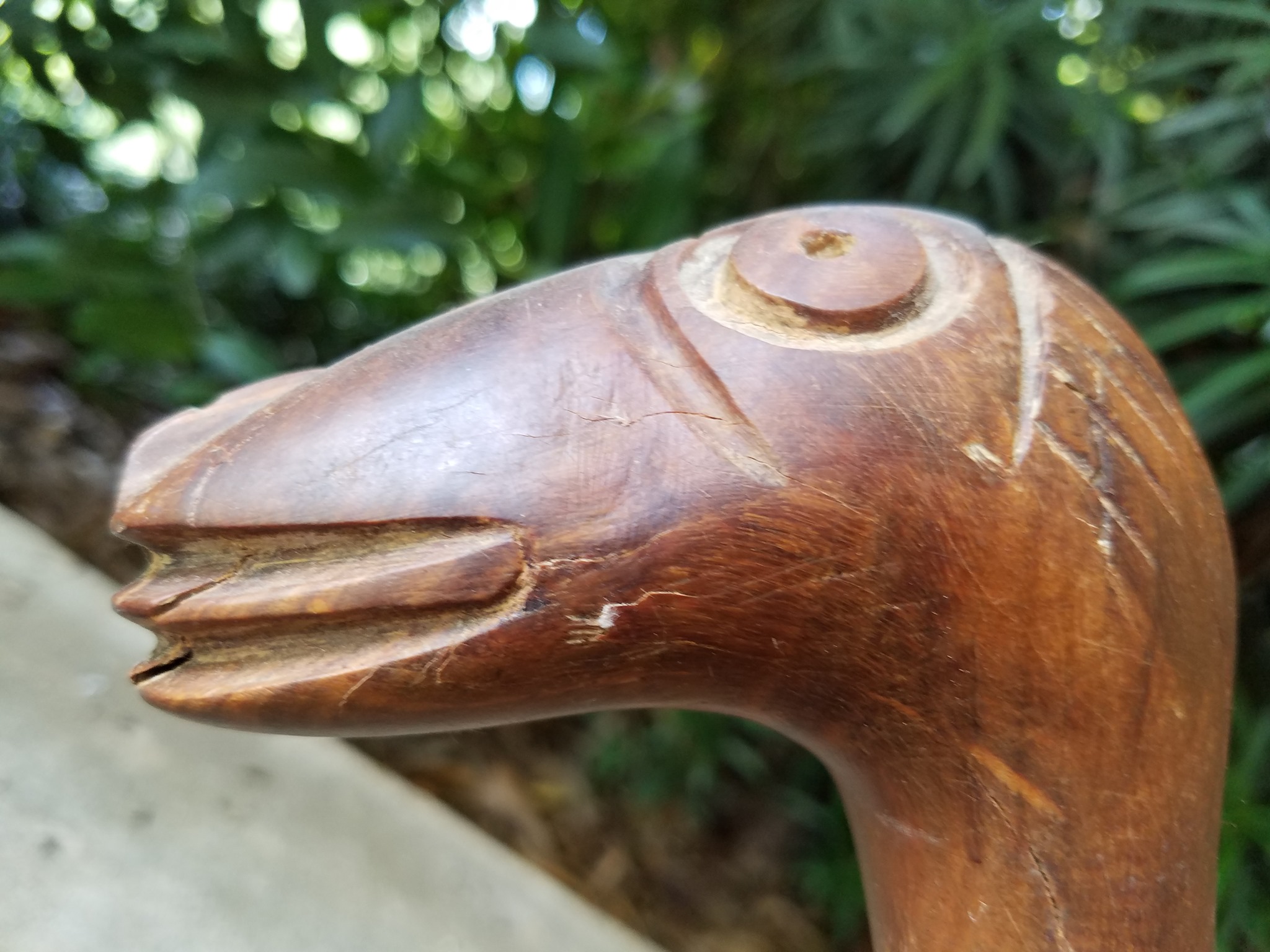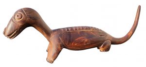 Below is a carving that showed up in a souvenir shop in the Congo in the 1980s. The indigenous artist was clearly trying to depict a long-necked, long-tailed animal. Notice that it seems to be herbivorous (no sharp teeth depicted). The stubby feet match up well with the appendages of a sauropod dinosaur, though the legs are quite short. It has a curious frill down the back, much like the spikes many paleontologists think sauropods like Diplodocus sported. There is no depiction of an ear, an accurate representation of a dinosaurian reptile. The piece is 15″ long and stands 6″ tall.