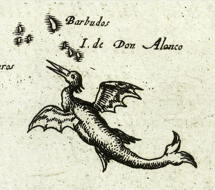 Shortly after World War II, as western missionaries began to penetrate the deep jungles and remote islands of Papua New Guinea (PNG), stories of a flying creature called the Ropen (“demon flyer”) began to be reported. Duane Hodgkinson was stationed east of Lae, near Finschaven, PNG as part of the Army cavalry in 1944. About noon one day in August he was walking down a trail through a clearing in the forest when he was startled by a crashing in the brush. As he watched a large bird-like creature ponderously rose from the ground, circled and flew away. Hodgkinson, a pilot, estimated the wing-span to be that of a small airplane, about 25 ft. He clearly recalls the dark-gray coloration, long serpentine neck, beak, and distinctive head crest. Described as a nocturnal creature, the Ropen possesses two leathery wings like a bat, a long tail with a flange on the end, a beak filled with teeth, and razor-sharp claws. An intriguing sea chart dated 1595 warns mariners to beware of a variety of “sea monsters.” It depicts two flying creatures (See below on right) with a long necks, headcrests, ribbed wings and fantastical tails (split on the end like a flipper) flying above the islands of New Guinea. One is even shown as having dermal bumps. (Sweeney, James B., A Pictorial History of Sea Monsters, 1972, p. 42.)