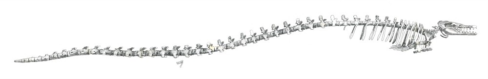 In the 1800s there ere a number of sea serpent sightings off the coast of Gloucester, MA. One incident involving numerous witnesses in Nahant Bay was memorialized with a sketch (right). Although this massive serpentine form is not known in our fossil archives, zoologist Karl Shuker speculated that some of these encounters Basilosaurus Skeleton3might have involved a still-living Basilosaurus (right), a slender eel-like creature supposed to have been extinct for millions of years. (Shuker, Karl, Dragons: A Natural History, 1995, p. 38.) It possessed small fins, a flexible neck, a tail fluke, and could undulate its long body vertically (unlike terrestrial snakes that coil horizontally). The fossil creature was given this name because the early 19th century paleontologists thought it to be very reptilian. Indeed “Basilosaurus, which is over 20 m long and, unlike modern whales, must have looked like a classic sea serpent because of its tiny head and long, thin body.” (Benton, Michael, Vertebrate Paleontology, 2015, p. 373.)