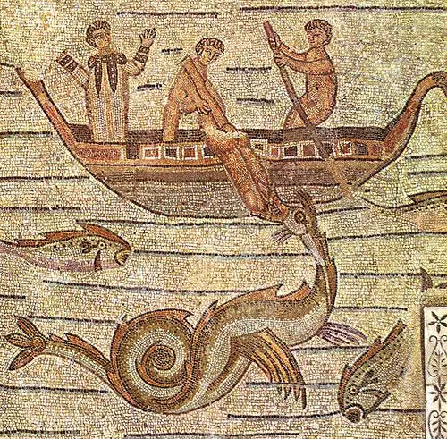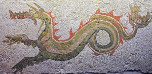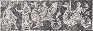 Roman Mosaic from Lydney Park Color Croppedtanystropheus fishing croppedTo the far right is the Roman mosaic from about 200 AD found at Lydney Park Temple in Gloucestershire, UK. The mosaic depicts two long-necked sea dragons (click to enlarge). Some fish are shown in the mosaic as well. Creationist Paul Taylor likens the dragons to the web-footed Tanystropheus shown immediately to the right.