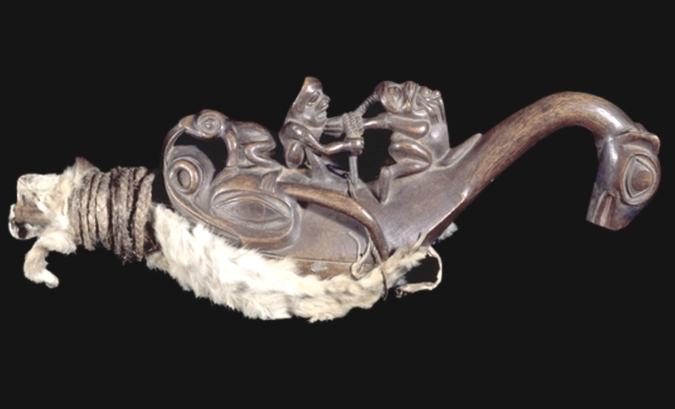 Shaman's Rattle - Sea Monster2From the Pacific northwest of America comes an intriguing sea monster shaman’s rattle, shaped roughly like a plesiosaur. This Tlingit artifact from Alaska shows a shaman on the back of the monster, tying up a witch. A frog (representing and evil spirit) is on the back of the long-necked creature and another frog is emanating from the witch’s mouth. The piece, currently housed in the British Museum in London, certainly bears a remarkable resemblance to the great marine reptiles.