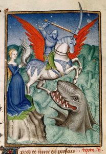 The mosasaurus was a monstrous marine lizard (presumed to have become extinct about 70 million years ago) that grew up to 56 ft long, had large eyes, swam with powerful flippers and sported ferocious conical teeth. A modern reconstruction of a mosaurus is seen on the left. To the right is a depiction from the Middle Ages of St. George slaying the dragon. Although presentations of this event are ubiquitous in Medieval art, this is a rare portrayal of the monster as a swimming dragon, defending the captured princess on his island from the rescuing knight. Note the similarities to the mosasaurus’ unique features. Could Medieval sailors have seen the head and neck of these monsters poke out of the water in the way shown in this picture during their long, quiet days at sea?