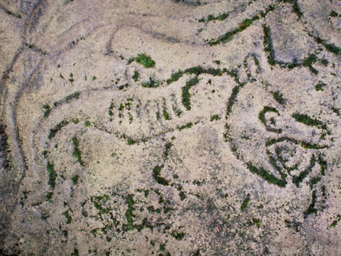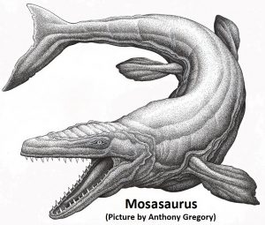 Petroglyph from Makah Indian Reservation in WAnorthwest-sea-serpent-carving2Native Americans of the Pacific Northwest have legends of the “Sea Wolf” or “Sea Alligator,” a fearsome, toothy ocean creature that attacked and ate whales. What did these Indians observe as they traversed the region of the Oregon coast, Puget Sound, and Vancouver Island in their canoes? Could this whale-eating marine saurian be a Mosasaur? Rock carvings of the creature vary from across the region. The drawing to the far left is from an ancient petroglyph found at Makah Indian Reservation in WA. It shows a bulbous body, a head that sports a fin or crest (like the Carian urn above) with the typical prominent jaws and sharp teeth. It seems that a pilot whale (technically a member of the dolphin family) is depicted in the monster’s stomach. If this is so, the creature would scale to about 50 ft in length. The ancient rock carving to the right of it more closely resembles the streamlined, elongated form of the Mosasaur as we know it from the fossil record.