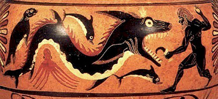 To the left is an urn from Caria, which was located in Asia Minor (modern Turkey). This artifact (described on page 114 of Thomas Carpenter’s 1991 book Art and Myth in Ancient Greece as “Herakles attacking a Ketos”) is estimated to be from 530 BC. It depicts what appears to be a Mosasaur with several obvious sea creatures. The animal behind the sea monster is a seal, while an octopus is below the creature along with what seems to be a small dolphin. The thick jaws, big teeth, large eyes, and positioning of the flippers on this creature match a Mosasaur skeleton very well. Some Mosasaur species also had a narrow cranial crest behind the eye that may have had a fin attached the way it is depicted on the Carian urn (click to enlarge).