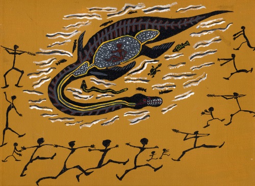 Plesiosaurs were a group of long-necked, round-bodied ocean-going reptiles that were believed to have gone extinct along with the dinosaurs. Nearly complete skeletons from England give us a very good idea of what these ancient sea monsters looked like and a modern reconstruction of a swimming plesiosaur is shown to the left. However, there are stories of a plesiosaur-like creature seen in Queensland, Australia. Both aboriginal peoples around Lake Galilee and tribes farther up to the north tell of a long-necked animal with a large body and flippers. “Elders of the Kuku Yalanji aboriginal tribe of Far North Queensland, Australia, tell stories of Yarru (or Yarrba), a creature which used to inhabit rain forest water holes. The aboriginal painting to the lower left depicts a creature with features remarkably similar to a plesiosaur. It even shows an outline of the gastro-intestinal tract, indicating that these animals had been hunted and butchered.” (CEN Technical Journal, Vol.12, No. 3, 1998, p. 345.) The tribal stories tell how the Yarru once devoured a young maiden. A missionary asked one of the tribe’s artists to paint the story. The Aboriginal artist, with very little formal education, had no knowledge of what ancient plesiosaurs looked like, and was drawing only from the details handed down in the ancient stories.
