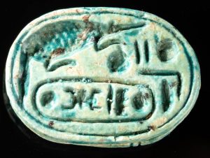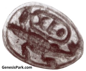 An Egyptian scarab seal (right) has been found with the cartouche (official name inscribed within an oval) of Tutmosis III. It is from approximately 1400 B.C. This seal appears to show a long-necked plesiosaur-like animal. The anterior and posterior flippers are distinctively represented with the narrow connection to the rotund body of the creature. The seal was originally part of the Mitry collection and is of unquestioned authenticity. The ancient Egyptians are known for their keen observation and accurate zoological representations, particularly with regard to river and sea creatures. Some have suggested that it is a poor representation of a crocodile. But compare this to the seal just below (also from the Mitry collection) which clearly shows a Nile Crocodile. Especially note the differences in the neck, head, snout and feet.