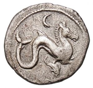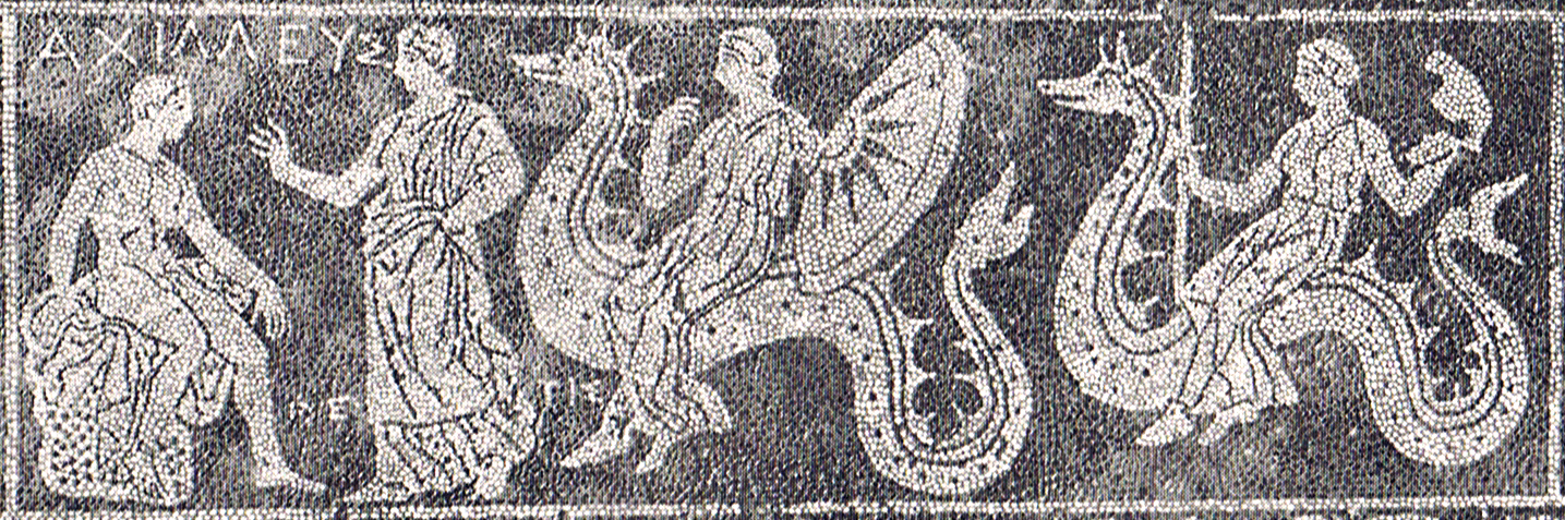 Medieval silver coins from Lucca, Italy were highly popular at the time of the Crusades. A number of these are housed in museums today. A common motif is the ketos (sea monster) in the form of a sea serpent. Notice the coin to the right, which is part of the coin collection at the Berlin State Museum. The dolphin depicted below provides scale and helps us appreciate the immense size of the sea monster! A popular story from Greek mythology involves the Nereids (sea nymphs) bringing armor to the city of Troy for the great warrior Achilles. These women of the sea, kin to the mermaids, are typically shown riding on sea serpents. Below left is a painting that is displayed at the Museum of Ruvo di Puglia in Italy. To the bottom right is Greek art showing the Sea Goddess Thetis meeting Achilles, with the Nereids following behind her. It is dated to about 400 BC.