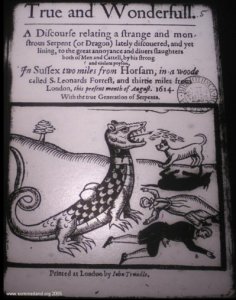 “True and Wonderfull. A Difcourfe relating a ftrange and monftrous Serpent (or Dragon) lately difcouered, and yet liuing, to the great annoyance and diuers flaughters both of Men and Cattell, by his ftrong and violent poyfon, In Suffex two miles from Horfam, in a woode called St. Leonards Forreft, and thirtie miles from London, this prefent month of Auguft. 1614. With the true Generation of Serpents. Printed at London by Iohn Trundle.