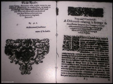 …there is difcouer’d in our neighbour Countie of Suffes, a ftrange and monftrous Serpent (a thing moft noyfome and dreadfull to the Inhabitants…It is likewife difcouered to haue large feete, but the eye may be there deceaued, for fome fuppofe that Serpents have no feete, but glide uppon certaine ribbes and fcales which both defend him from the upper part of his throat unto the lower part of his bellie, and alfo caufe them to moue much more the fafter, for fo doth this by firft drawing together then floating forth, ridsway (as we call it) as faft as a man can run. It is of countenance very proud and at the fight or hearing of men or Cattell, will raife his necke upright, and feeme to liften and looke about with great arrogancey: There are likewife on either fide of it difcouer’d two great bunches fo big as a large foote ball, and (as some thinke) will in time grow to wings, but God (I hope) in their and our affiftance will go infruct and defend us that hee fhall bee deftroy’d before hee growe fo fledge.