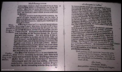 This booklet from 1614 contains some interesting accounts of dragons, written in the old English. Amidst speculation about the copulation of these fearsome serpents and legends of their supernatural abilities is a lucid descriptions of a dragon slain in the neighboring Sussex county and numerous references to even more ancient historical sources. Below are a couple of excerpts. (Mentally substituting an “s” for the old “f” can often assist the comprehension.)
