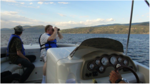 took about 20-30 seconds. By the time we grabbed our high-definition video camera, powered it up and started recording, only the final wake was to be seen. The depth finder was registering over a hundred feet and the coordinates on the sighting are N50 d. 10.534” – W119d. 27.097”. Despite days of follow-up work, both on the lake and traveling along the shore, no other observations were made. After having been monster hunting at Lake Champlain, Loch Ness, Lake Memphremagog, Lake Nahuel-Haupi, the Great Lakes, and the Salish Sea (home of Cadborosaurus) this is the first swimming cryptid sighting by the Genesis Park team.