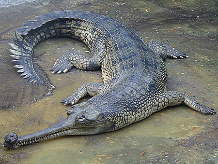 Gharials (also known as ghavials) live only in South Asia. They have the longest snout among the crocodilians. The broad-fronted crocodiles usually feed on animals that venture too near there watery lair, whereas gharials are specialists that eat mostly fish. The gharial catches the fish with a quick sideward snap of its narrow jaws. Once the fish is impaled on its sharp teeth, the gharial lifts its head out of the water, opens its jaws with a jerk and the fish disappears down its throat. Some gharials ambush small mammals, crabs and even birds from the shore.