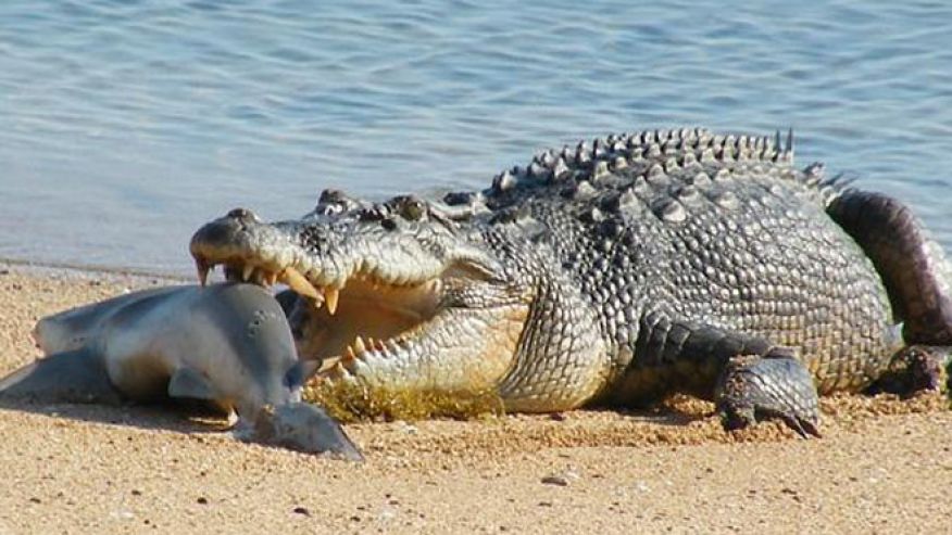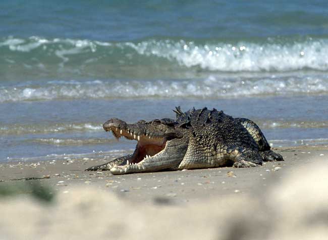 Saltwater crocodiles feed on fish as well as birds and mammals that venture too close. They have even been known to eat toads (whose toxins typically kill other crodilians). Because of their power, intimidating size and speed, these reptilian monsters have been known to attack and kill humans. Agile swimmers, they have been clocked at 18 mph in the water, three times faster than humans can swim. On average, one person a year is killed in Australia because of their attacks. The wide jaws have the strongest bite of any animal known, capable of instantly crushing even the skull of a large goat. But despite that ferocious closing force, the crocodile’s opening muscles are rather weak. This allows crocodile handlers to keep their mouths shut with just a few wraps of duct tape.