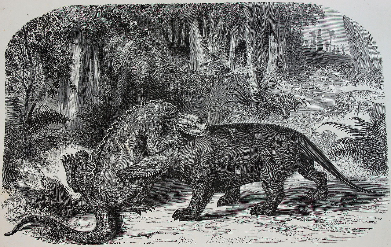 The first recorded dinosaur remains found consisted of a few teeth and bones discovered in 1822 in Sussex, England, by an English doctor, Gideon Mantell. He named them Iguanodon or “iguana tooth.” Not long after this first find, other fossil teeth and bones were found near Oxford, England, by Rev. William Buckland. These were named Megalosaurus (“great lizard”). Early reconstructions of the Iguanodon look laughable today since those early paleontologists envisioned them merely as big lizards. The lumbering, bear-like Megalosaurus was not drawn much better (see the picture from 1863 of the two dinosaurs represented in combat).