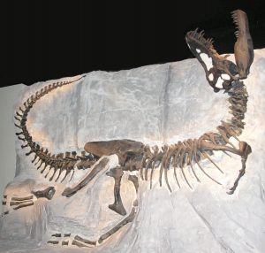 When a complete skeleton is found intact, it provides much more information to the paleontologist than a loose pile of bones. One of the striking characteristics of many of these connected skeletons is that they exhibit a peculiar contorted position popularly called the “death pose.” This pose of many fossilized dinosaurs, with wide-open mouth, head thrown back and recurved tail, likely resulted from the agonized death throes typical of brain damage from asphyxiation, according to paleontologists. “An extreme, dorsally hyperextended posture of the spine (opisthotonus), characterized by the skull and neck recurved over the back, and with strong extension of the tail, is observed in many well-preserved, articulated amniote skeletons (birds and other dinosaurs, pterosaurs, and at least placental mammals). Postmortem water transport may explain some cases of spinal curvature in fossil tetrapods, but we show how these can be distinguished from causes of the opisthotonic posture, which is a biotic syndrome.” (Faux, Cynthia Marshall, Padian, Kevin, “The Opisthotonic Posture of Vertebrate Skeletons: Postmortem Contraction or Death Throes?,” Paleobiology, Spring 2007.)