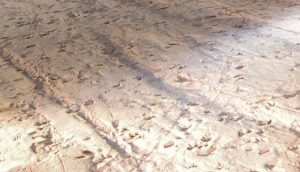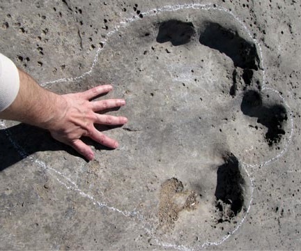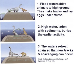 In the documentary film “Is Genesis History?” Dr. Marcus Ross points to another fascinating characteristic of dinosaur fossil trackways. He has documented numerous cases where the first (lowest) evidence of a particular dinosaur species is the fossilized tracks. Then in the higher rock layers one finds the fossilized bones. In the old earth evolutionary scenario, this makes no sense. If there are creatures leaving tracks for millions of years, there should also be preserved bones, teeth and skeletons. Obviously, the evidence is pointing a different direction. There is very little time gap between the lower layers where the dying dinosaurs were leaving tracks and the higher sediment layers where they eventually expired and were buried.
