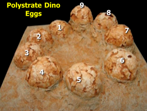 One additional item is of note with regard to dinosaur eggs. Some of these nests are polystrate fossils, that is they go through multiple rock layers. These layers might be interpreted as millions of years apart. But the eggs would never have been able to survive for eons while the next rock layer was slowly deposited. No, the layers must have been forming rapidly. In some cases the layers were forming while the mother dinosaur was laying her eggs. Notice the fossil nest to the left. This nest, found in Mongolia, shows how the dinosaur swiveled around and laid her eggs one after the other even as the muddy waters swirled around her. Egg number one is buried deep in the mud while number 9 is atop the sediment layer! By the time she finished laying, inches of additional mud had built up. Or perhaps exposed sediment had dewatered so the egg no longer sank into it. These fossilized dinosaur eggs are further evidence of catastrophic global conditions. They are exciting support for the BEDS hypothesis and the Genesis Flood.