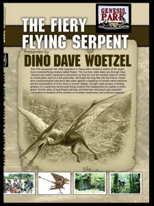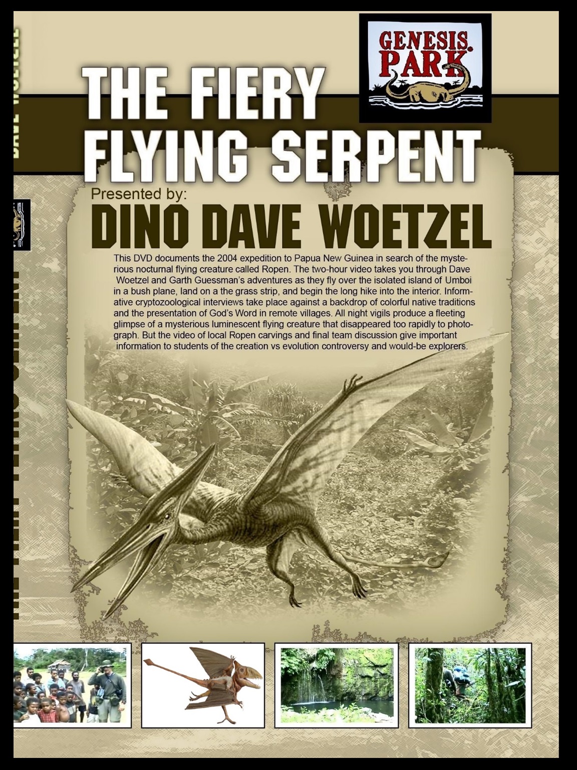 This DVD presents the Biblical and historical background regarding the “Fiery Flying Serpent” and then follows Dino Dave’s research in the country of Papua New Guinea, searching for the mysterious nocturnal flying creature called Ropen. The video takes you through Dave Woetzel and Garth Guessman’s adventures as they fly over the isolated island of Umboi in a bush plane, land on a the grass strip, and begin hiking. Informative cryptozoological interviews take place against a backdrop of colorful native traditions and the presentation of God’s Word in remote villages. All night vigils produce a fleeting glimpse of a mysterious luminescent flying creature. The final team discussion gives important information to students of the creation vs evolution controversy and would be explorers.
